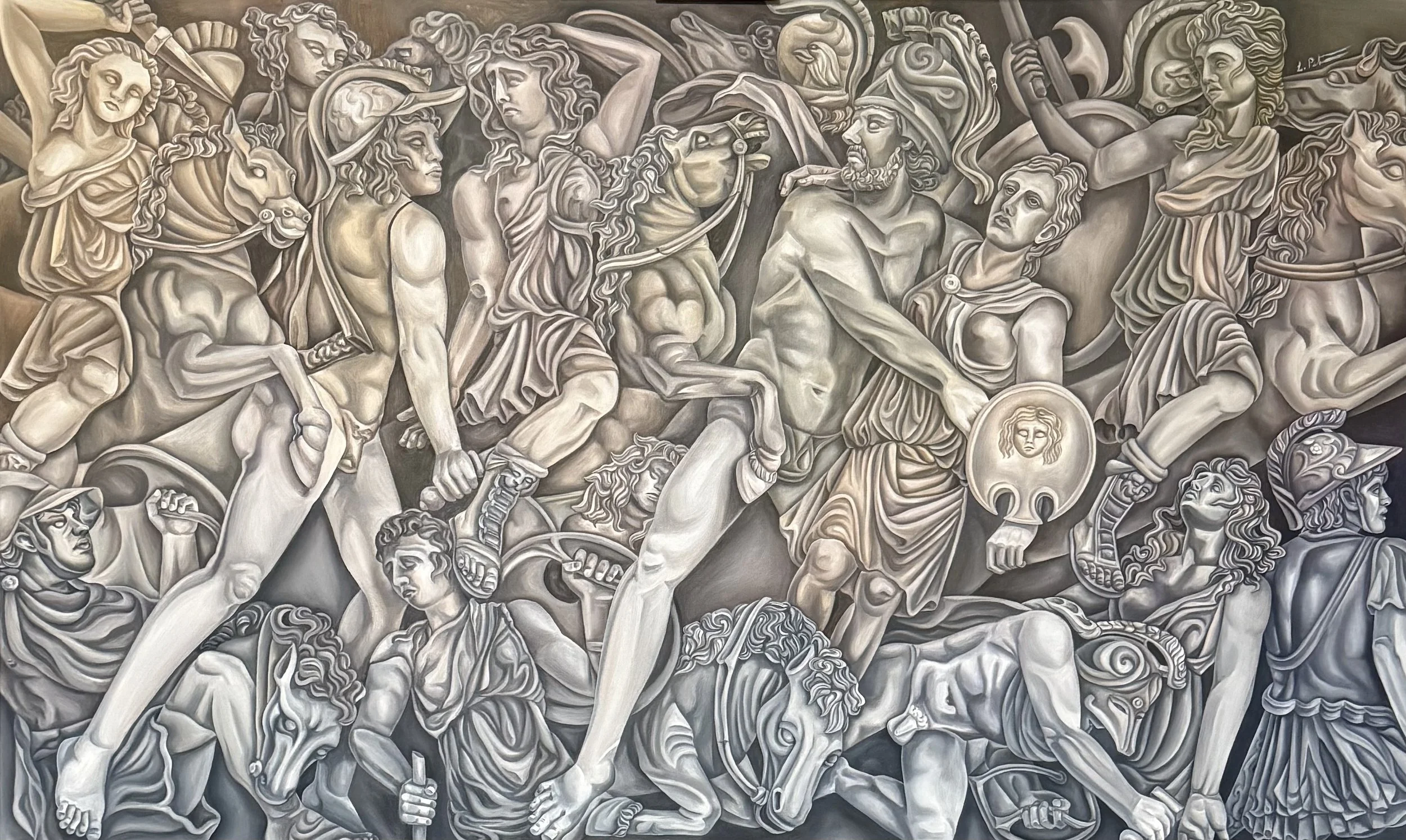 Colors of War explores Greco-Roman scenes during times of unrest and instability, portraying them in a modern style and on a larger-than-life scale. Each piece is meant to immerse the viewer in the chaos, disorder, and uncertainty of the scene, calling to mind our current collective experiences during times of global political turmoil. Each painting serves as a meditation on the similarities between the past and the present, as well as a somber reminder of the persistence of violence in our world.