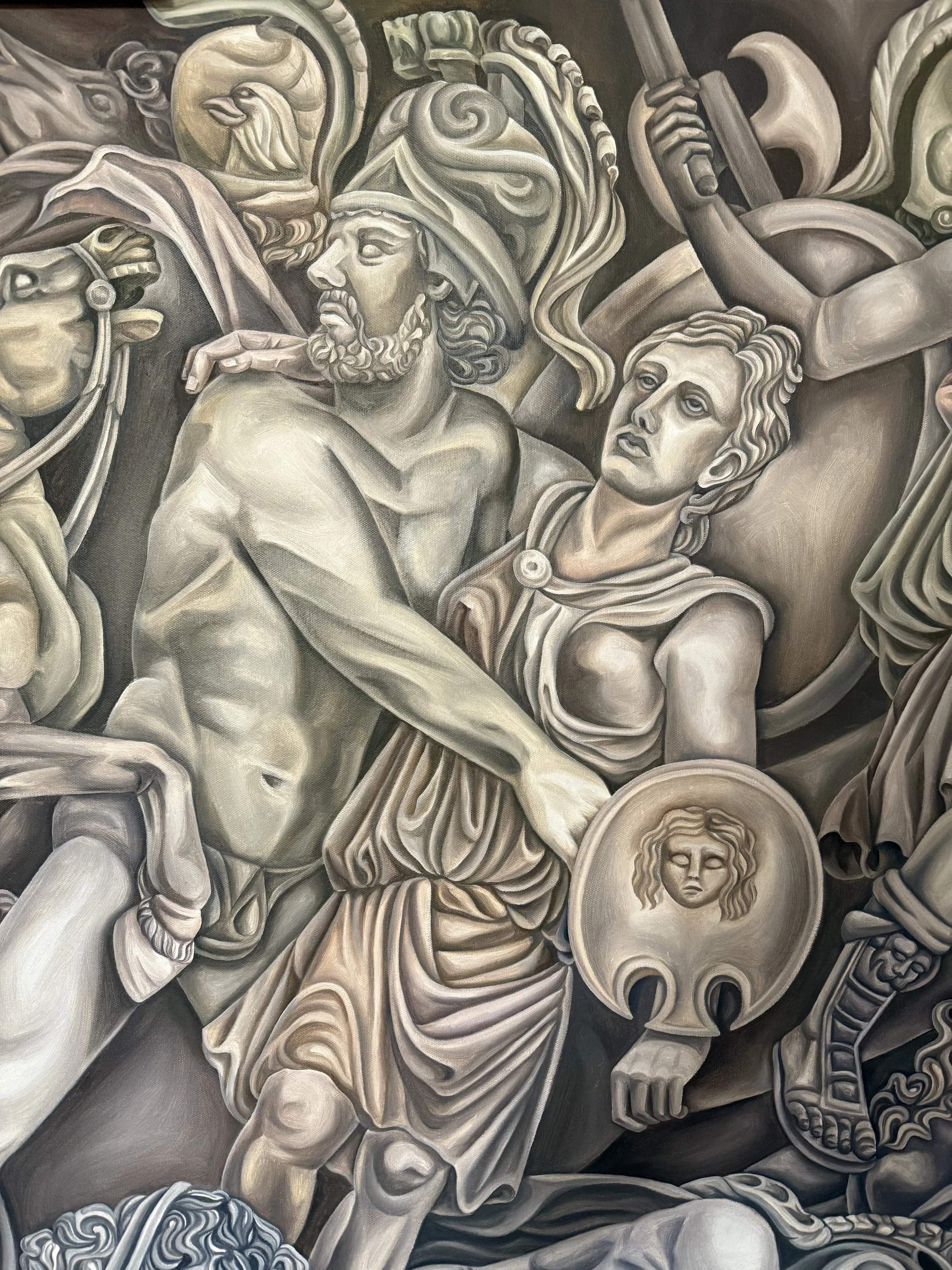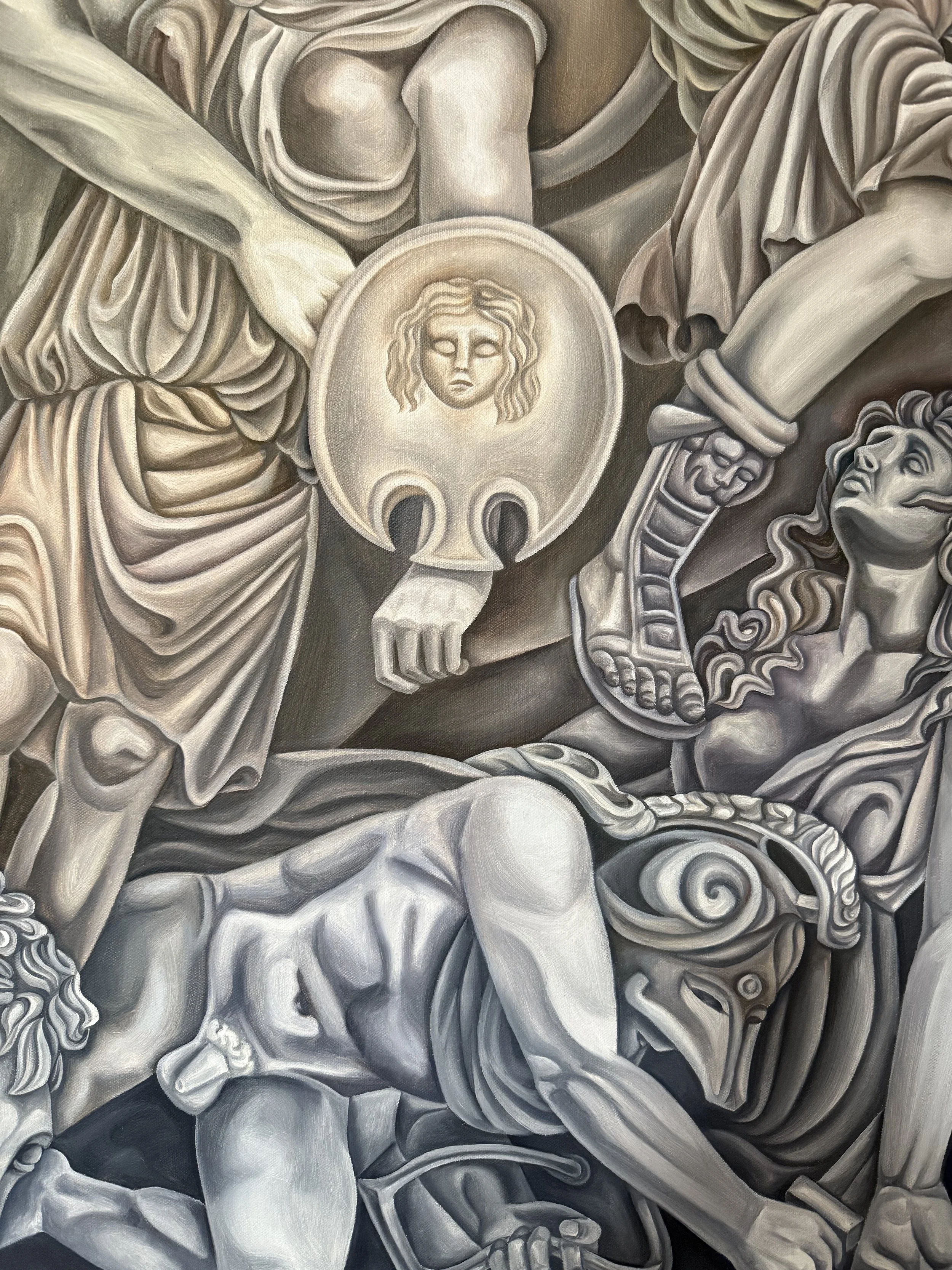 Completed in Boston, Amazonomachy I is the reimagination of Greeks vs. Amazons, which was completed by the artist in 2022. This piece is the first of a triptych depicting a battle between the Greeks and the Amazons, taking inspiration from an ancient sarcophagus with the same imagery.